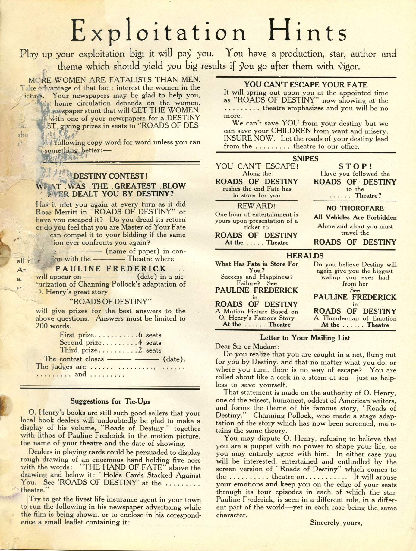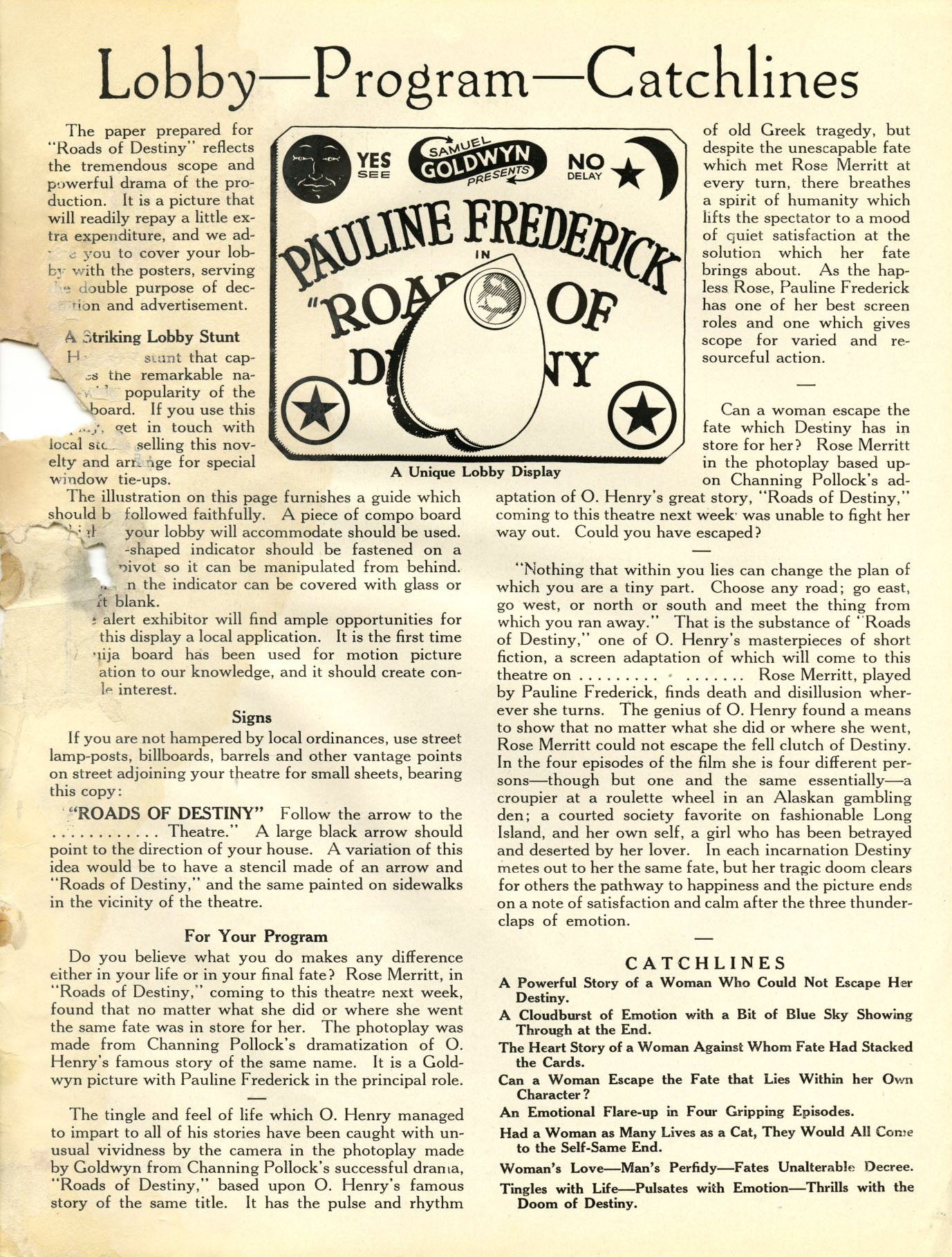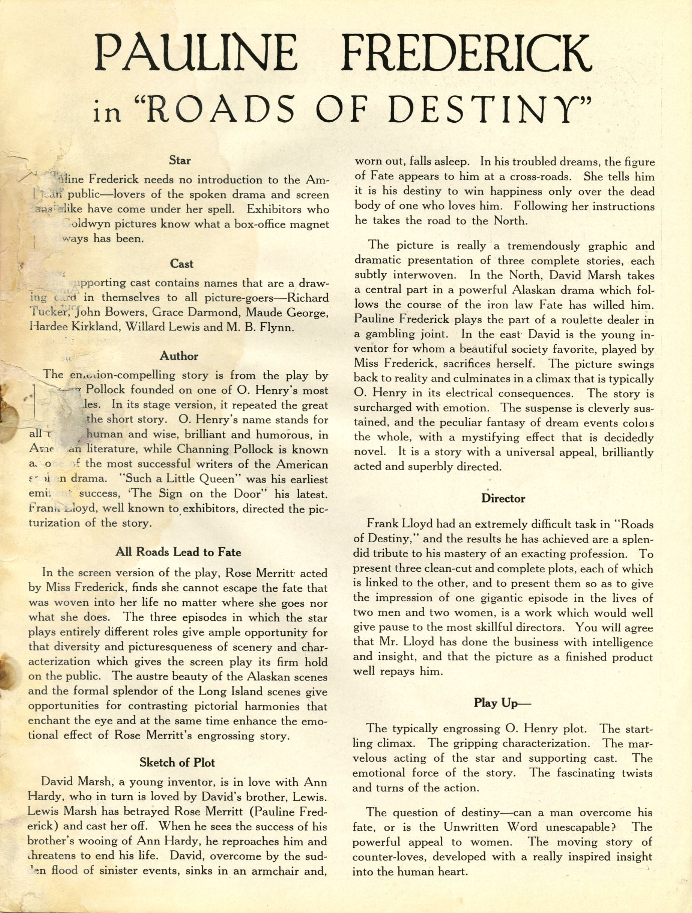 Exploitation Angles: Play up the star and link her name with O. Henry's, then feature the three dramas and the opportunities it affords Miss Frederick. You can use the street sign stunt for exploitation, telling that this road of destiny leads to your theatre with arrows pointing the right direction.