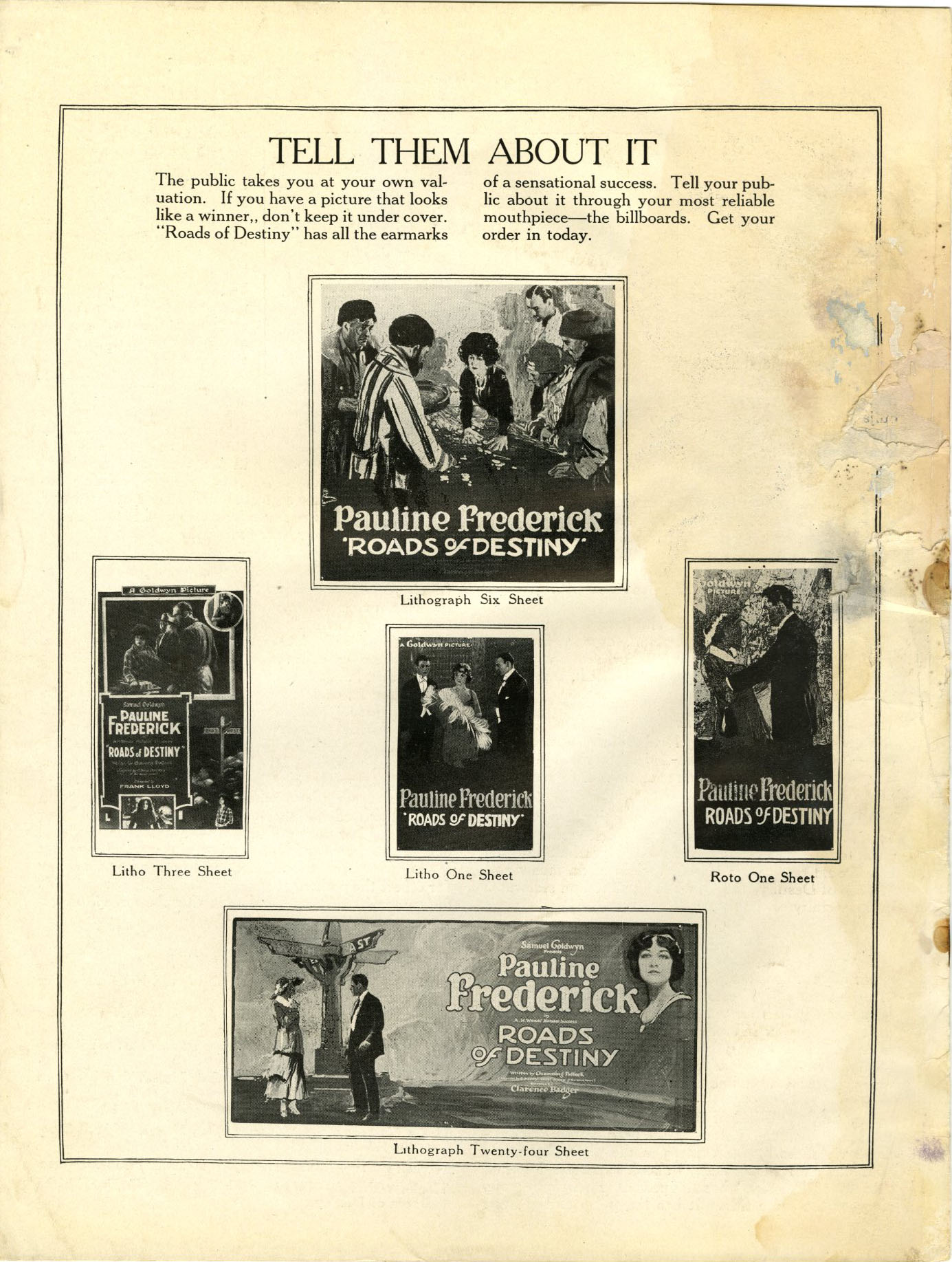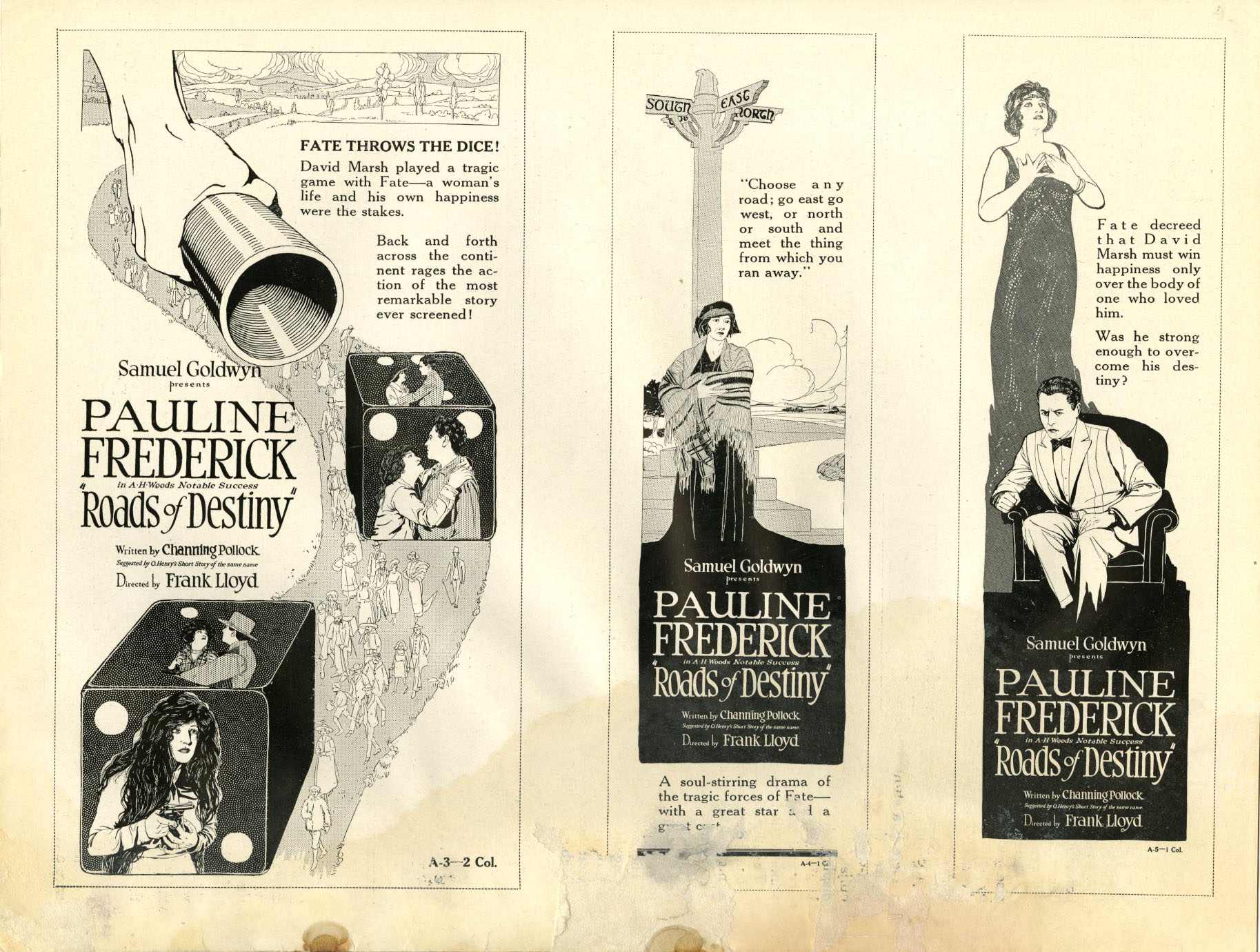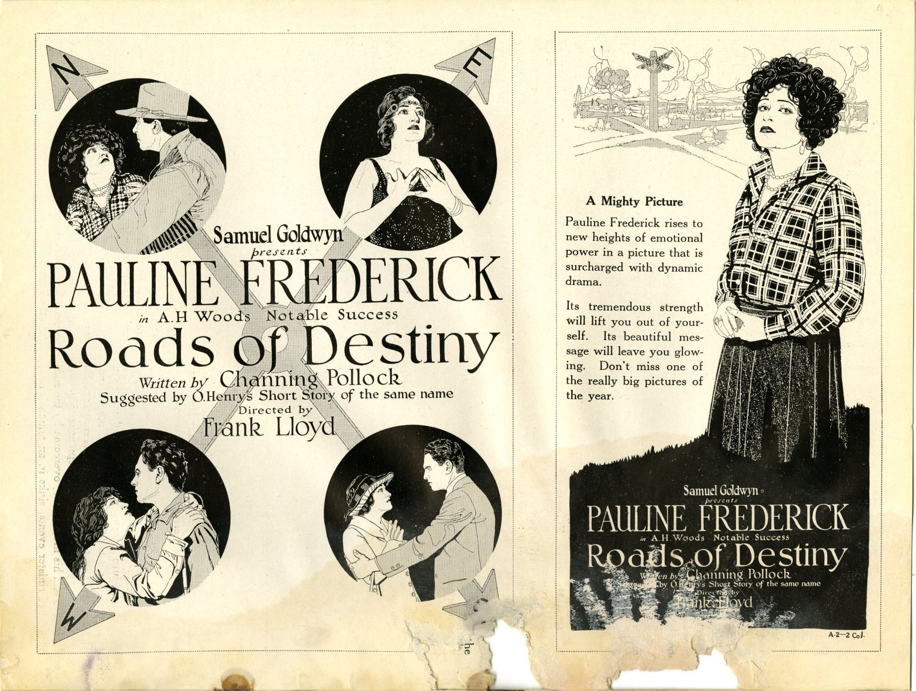 Exploitation Angles: Play up the star and link her name with O. Henry's, then feature the three dramas and the opportunities it affords Miss Frederick. You can use the street sign stunt for exploitation, telling that this road of destiny leads to your theatre with arrows pointing the right direction.