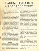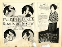 Roads of Destiny (1921) Goldwyn Pictures Corp. Director: Frank Lloyd. Scenario: J. E. Nash. Camera: J.D. Jennings. Cast: Pauline Frederick, John Bowers, Richard Tucker, Jane Novak, Willard Louis, Maude George, Maurice B. Flynn. In real life and three dream sequences in different locales, betrayed woman cannot escape her fate. 5-6 reels. LOST