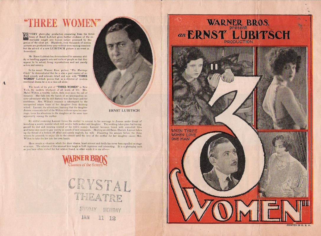 Once again has Ernst Lubitsch demonstrated his versatility and remarkable ability as a director. In "The Marriage Circle" he showed he was as much in his element with clever and sophisticated domestic comedy with a continental flavor as with the heavily romantic and spectacular productions, which made him famous. Now in "Three Women," his newest picture for Warner Brothers, he has taken an intimate story with an American setting, that is straight domestic drama dealing with human frailties and handled it in the same masterful way.