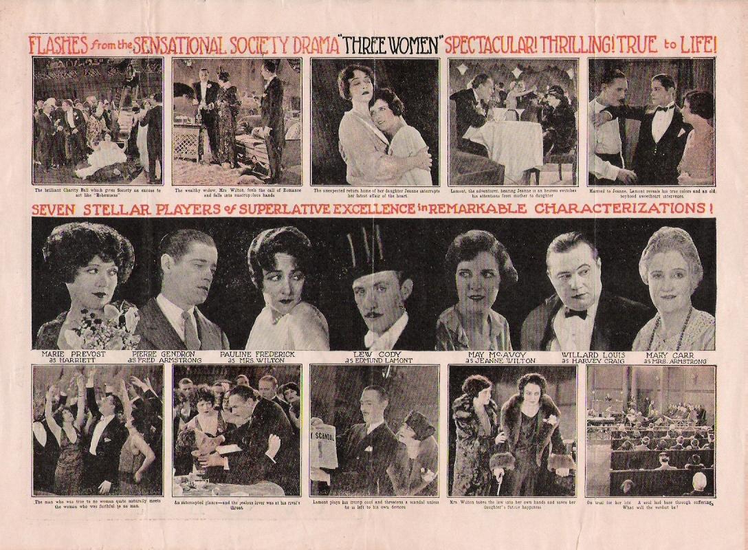 Three Women (1924) Warner Brothers Pictures. Director: Ernst Lubitsch. Scenario: Hans Kraly. Story: Ernst Lubitsch, Hans Kraly. Camera: Charles J. Van Enger. Art Director, Svend Gade. Assistant Directors, James Flood, Henry Blanke. Cast: May McAvoy, Pauline Frederick, Marie Prevost, Lew Cody, Willard Louis, Pierre Gendron, Mary Carr, Raymond McKee, Max Davidson. 8 reels.