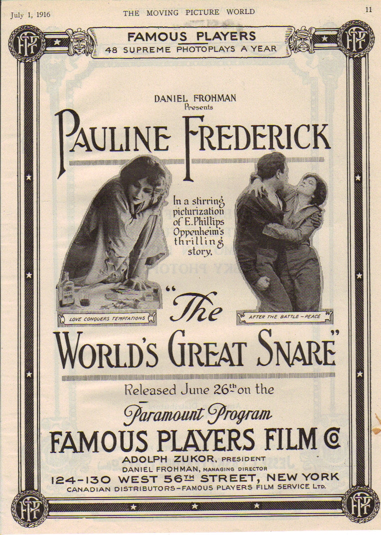 The World's Great Snare (1916) Famous Players Film Co. Distributor: Paramount Pictures Corp. Director: Joseph Kaufman. Camera, Edward Gheller. Cast: Pauline Frederick, Irving Cummings, Ferdinand Tidmarsh, Frank Evans, Riley Hatch, Buckley Starkey. 5 reels. This film appears to be LOST