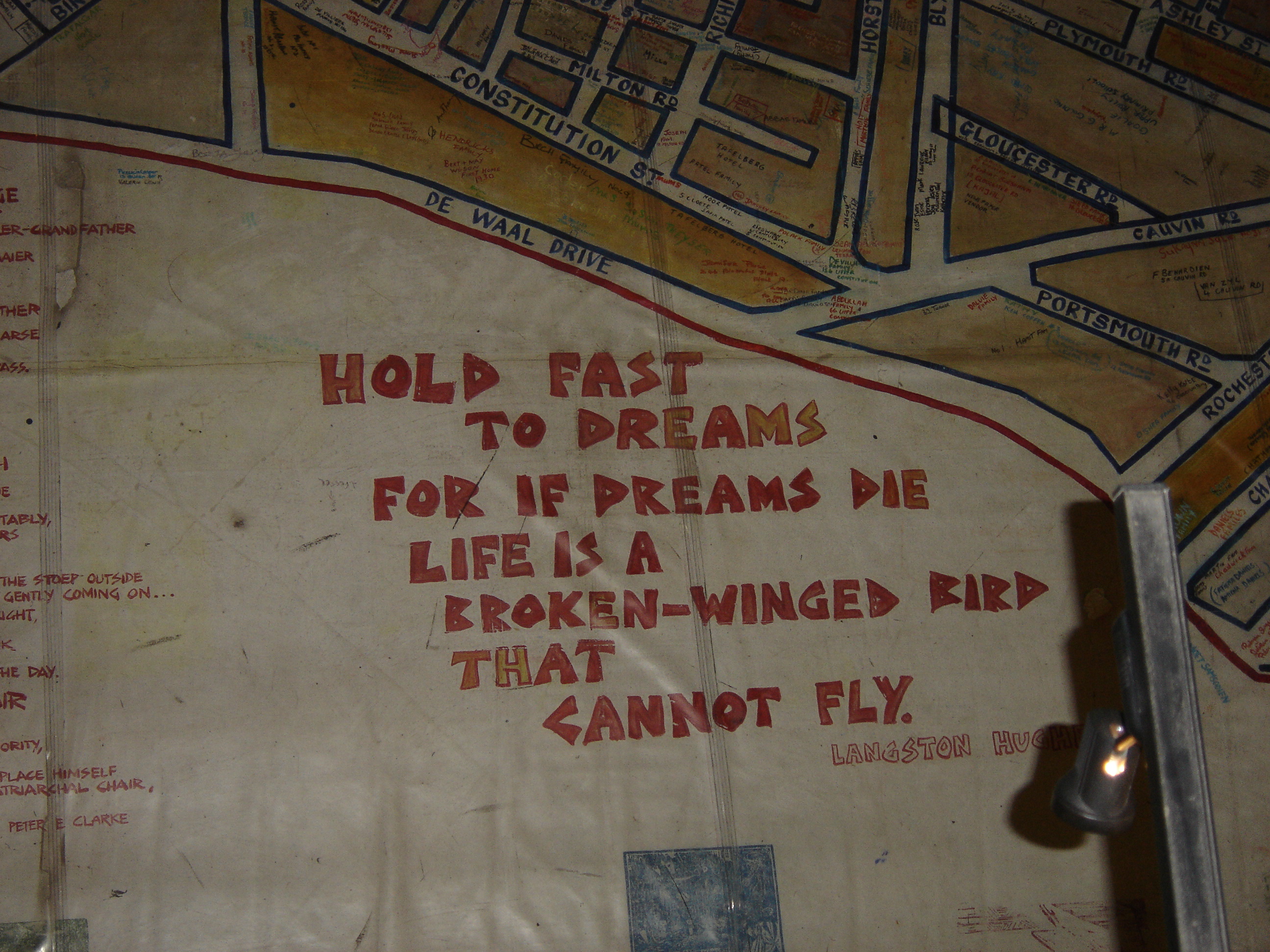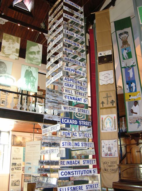 Above: a museum display of the street signs that once stood in District Six. After the creation of the museum, a sympathetic bulldozer operator came forward, confessing that he had collected the signs from the rubble.