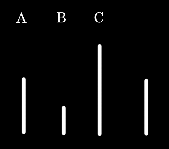 Take a look at the following picture. Which line, A, B, or C, is the same length