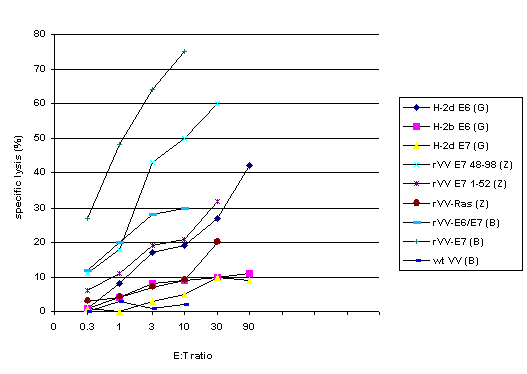 While the results from these 3 studies are not completely comparable because different immunization protocols (dosage, number of vaccinations, intervals between vaccinations, haplotypes of mice tested) were employed, graphing them together shows the general trends clearly, with antigen-specific CTLs being induced and capable of target cell lysis in vitro following immunization with antigen-expressing rVV compared to immunization with wild type vaccinia virus and other controls.