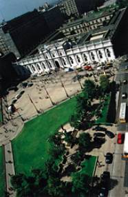 El Palacio de la Moneda fits the pattern of a European city more than the model of a North American city. The building is very symmetric and geometric; though it does not suggest grandeur, it symbolically signifies order. La Moneda is also historically important because it was built during Chile’s colonial era, and it represents its traditional patrimonio construido. The area surrounding La Moneda is organized in a planned fashion, unlike many cities of North America.The Plaza de la Constitución, which is in front of the main façade of La Moneda, opens up a large space in front of the president’s office and gives the feeling of dignity and importance.