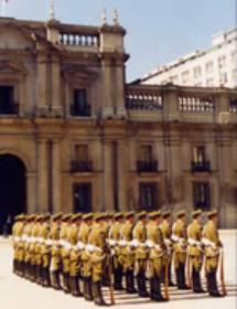 It’s a pretty building; they restored it after the military coup. It has many different salons and patios. President Lagos opened it up to the public; before people weren’t allowed in the patios. There are many things going on around there, like protests. Protesters often deliver letters to the building. Every morning they have the changing of the guard.