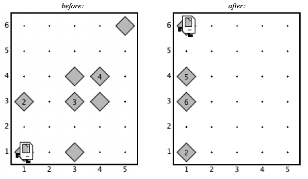 Note that, in each row, Karel has gathered all beepers in that row and placed them on the leftmost square. If there are no beepers in a row, Karel should not place any beepers in that row