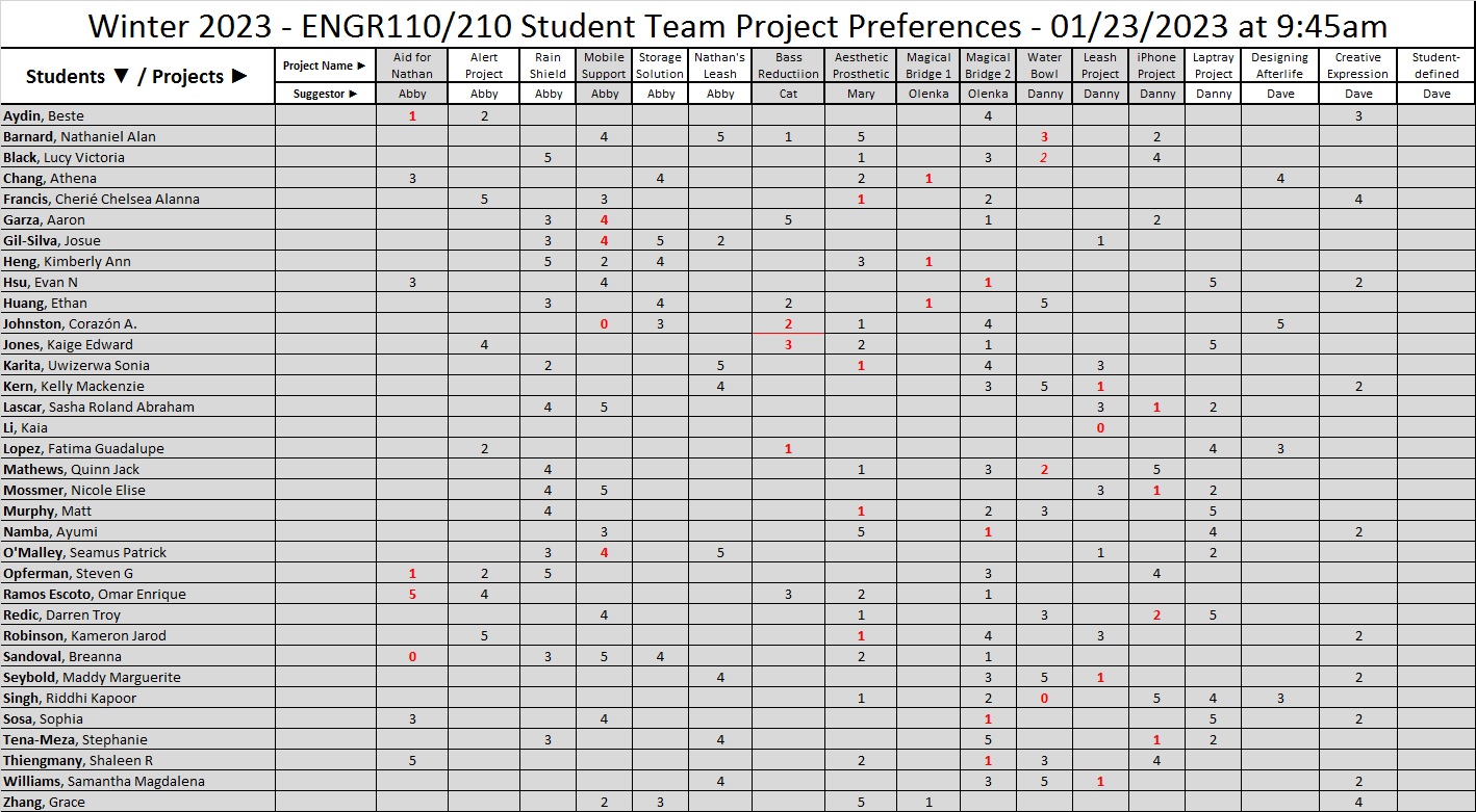 students who desire to work on team projects, their project preferences, and