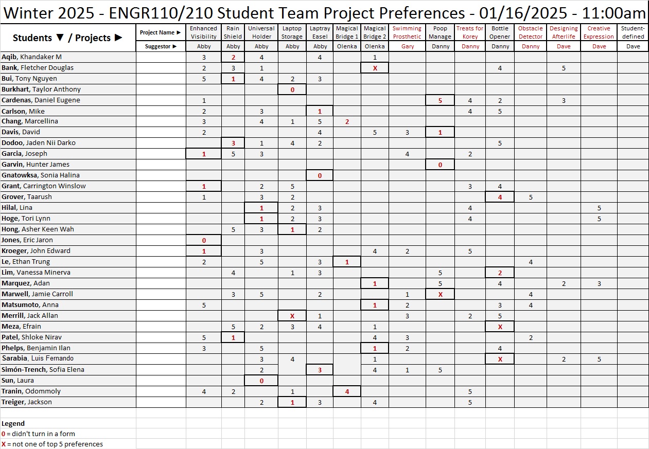 students who desire to work on team projects, their project preferences, and