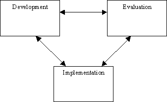 Development, evaluation, and implementation are part of a logical progression in any situation that has an end product. If a company produces a computer program for balancing your checkbook, for instance, they need to 1) design it with the needs of the end users in mind, 2) evaluate it in house and encourage outsiders to review it, and 3) have a mechanism to implement it, including figuring out how to make it available and training end users in its effective operation.