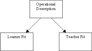 Evaluation involves three kinds of considerations. A crucial aspect of evaluation is to understand what the courseware does first before attempting to judge it. The first consideration then is the operational description of the software, which essentially focuses on the procedure level elements. The design elements essentially can be subsumed under the label "learner fit." That is, based on the information from the operational description, you are looking to see how well the design elements of language difficulty, program difficulty, program content, etc. fit the students you are evaluating for. The approach elements, in this case approach-based evaluation criteria, can be subsumed under the label "teacher fit". Ultimately, then, evaluation consists of getting a clear understanding of what the software actually has in the way of material and interaction, and then judging how closely it fits with the learner's needs as determined by their profiles and learning objectives (perhaps themselves determined by a course syllabus) and your own language teaching approach. This relationship is sketched below.