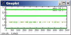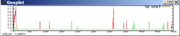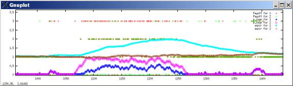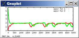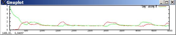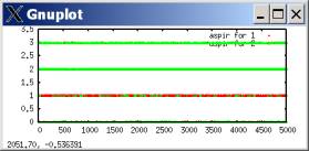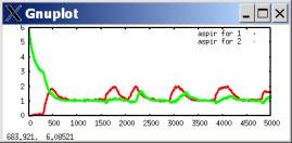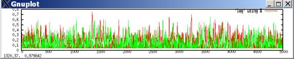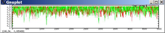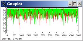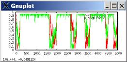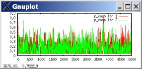In such a case, defection tends to predominate, with occasional outbreaks of cooperation. These outbreaks occur when both players luckily explore cooperation and get higher aspirations; they then keep searching for a while, allowing some cooperation moves, until eventually better-paying defection tends to win out. The following plots the probability of a cooperate move for each player during the same simulation run.[2]