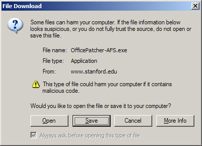 After clicking on the download link, the File Download window will be displayed. Click the Open button.
