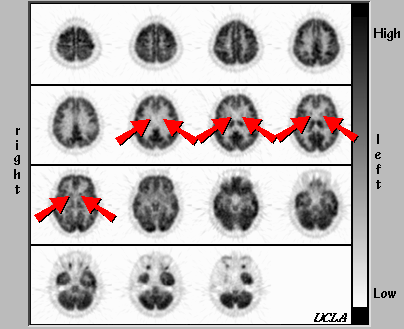 The diagnosis of Huntington's disease is indicated by the severe hypometabolism of the striatum. Despite a normal structural appearance on computed tomography, striatal glucose metabolism is often bilaterally reduced in subjects at risk for Huntington's disease. Thus, measurement of glucose metabolism may allow the observation of the pathophysiologic development of the disease. It may also provide a direct means to monitor the response to experimental treatments during both the clinically asymptomatic and the symptomatic phases of the disorder.