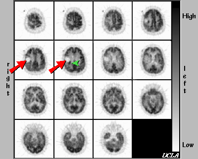 The region of ametabolism in right parietal lobe (red arrow) is consistent with resection. An area of hypermetabolism is seen in the posteromedial aspect of the surgical defect, suggesting tumor recurrence (green arrowhead). Other findings include a relative hypometabolism of the right posteroparietal cortex, and right thalamus, most likely due to radiation effects.Follow-Up