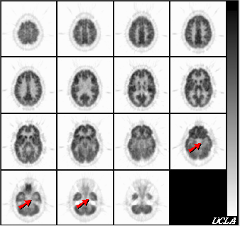 [Return to Case] Correct! The hypometabolism in the left mesial temporal region (arrows) is consistent with a seizure focus. No other foci are seen.