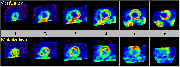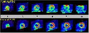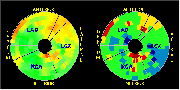 Click on image above to view full-size image.Shown above are the NH3-minus-FDG normalized polar map (left) and the NH3-minus-FDG matched polar map (right). Note that there is now little mismatch (i.e., few red regions). This study, performed under loaded conditions indicates that viable tissue is present in the antero-septal regions.