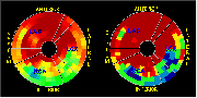 Click on image above to view full-size image.Shown above are the NH3-minus-FDG normalized polar map (left) and the NH3-minus-FDG matched (i.e., normalized to a normal patient data base) polar map (right). The red colors indicate mismatch between NH3 and FDG. Note that there is a definite mismatch in the anterior and septal regions. The severity of this mismatch compared to normals is made very clear in the NH3-FDG matched polar map on the right (very dark red regions).