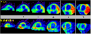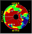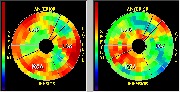 Click on image above to view full-size image.This polar map above was obtained by subtracting the metabolism polar map from the flow polar map. The areas in red represent the greatest mismatch. It is apparent that large areas of myocardium show a mismatch between flow and metabolism. This is consistent with an ischemic dilated cardiomyopathy condition, in which there are regions of low perfusion and hypermetabolism. Intervention with angioplasty or bypass surgery can be useful in these patients because flow can be restored and myocardial function improved. This is in contrast to (non-ischemic) dilated cardiomyopathy, where no intervention other than a transplant would be of significance.
