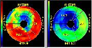 Click on image above to view full-size image.The left image represents the polar map obtained from the previous flow images, and the right image represents the polar map obtained from the previous metabolic images. Note that the antero-septal wall in each polar map shows a deficit. This is a matched study indicating little viable tissue in the poorly perfused antero-septal wall.