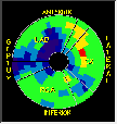 Click on image above to view full-size image.Depicted above is the flow-minus-metabolism polar map obtained from the flow and metabolism polar maps shown previously. Areas in red indicate mismatch. Note that this polar map is consistent with a matching defect, because there are essentially no red regions. This would once again support the conclusion that very little viable tissue is present in the poorly perfused antero-septal wall segment.