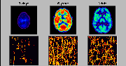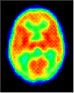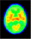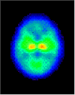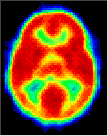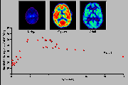 Click on one more more of the images above to view full-size image(s).The images above are a simulation of relative glucose utilization. In infants 5 weeks of age and younger, glucose utilization is highest in the sensorimotor cortex, thalamus, brainstem and cerebellum. The rate of glucose utilization is relatively very low in the basal ganglia and cerebral cortex at this age. By about 3 months of age an increase in glucose utilization is seen throughout much of the cerebral cortex, and the rate in the basal ganglia approaches that of the thalamus. In addition, the sensorimotor cortex, already active at birth, continues to show increases in activity. The frontal cortex and several association cortical regions, however, remain less metabolically active than the rest of the brain. A pattern of glucose utilization resembling the adult is seen as early as 8 months and typically by 1 year of age. Taken together the data on patterns of cerebral glucose utilization support the thesis that there is a relationship between a metabolic increase within neuroanatomical structures and the emergence of corresponding function. For example, neonatal behavior is primarily dominated by subcortical brain structure activity. Intrinsic brainstem reflexes, such as the Moro, root and grasp reflexes, are prominent. Visuomotor function is present only in rudimentary form, and cortical function is mostly limited to primary sensory and motor areas. By 3 to 4 months, purposeless limb movements begin to be replaced by more coordinated motions as the infant reaches out for objects. The increasing metabolic rate seen in the cerebellar hemispheres and parietal cortex may be important in this context. By 8 to 9 months, the cognitive development is thought to begin in the human infant and the PET images now show increased glucose metabolism in frontal and association cortices, areas intimately involved with higher cortical function.