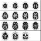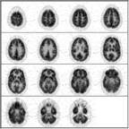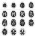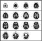 Click on image above to view full-size image.This is a normal PET scan. Abnormal PET scans will be compared with it in this tutorial about image quality control. The checklist on the right will be completed as we work through image quality control issues relating to neurological scan evaluation. This scan depicts fifteen planes (imaged simultaneously). The top of the brain begins in the upper left corner. Moving from left to right through each row, the final image is from the bottom of the brain.