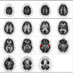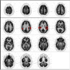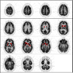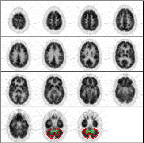 Click on image above to view full-size image.The thalamus is another brain region that exhibits relatively greater metabolic activity. Red outlines the thalamus in planes 8 & 9.