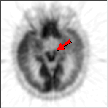 Click on image above to view full-size image.Another type of artifact is related to the placement of the patient in the scanner. To decide whether the head was tilted in the gantry, first locate the petrous ridges or bones. Normal bone has no FDG metabolism. The arrows point to the site of the petrous ridges (in plane 15 in this scan). The petrous bone appears in a PET brain scan as the absence of activity between the cerebellum and the inferior temporal lobe.