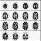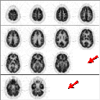 Click on image above to view full-size image.Lack of attenuation correction in the left image led to the characteristic "dip" in activity at the center of the skull (particularly in the striatum and thalamus). "Attenuation" refers to a weakening of the gamma-ray signal from an imaged site due to the presence of other structures. Bone causes higher attenuation than does soft tissue. Attenuation correction compensates for this weakening of the signal.