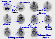 Click on image above to view full-size image.The palantine tonsils are oval masses of lymphoid tissue located on either side of the back of the tongue. They generally show intense activity in FDG-PET scans.