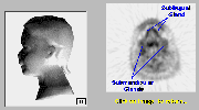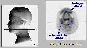 Click on image above to view full-size image.The sublingual and submandibular glands are salivary glands that secrete their contents into the oral cavity. The uptake of FDG in the sublingual gland is generally more intense than that of the submandibular glands (see also plane 11).