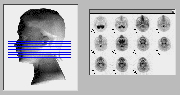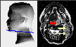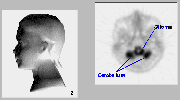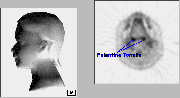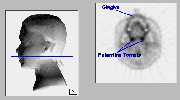 Click on image above to view full-size image.Shown above are a series of FDG-PET scans taken from the upper cervical region of the neck of a patient with a brainstem glioma. The approximate anatomical position for each scan is provided on the model on the left.