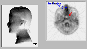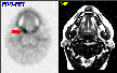 Click on image above to view full-size image.FDG-PET image through the high nasopharynx. The turbinates (nasal conchae) are covered with a metabolically-active mucosa involved in the circulation and filtration of inhaled air. This tissue also contains a vascular space involved in heat exchange. There is also increased activity in the lymphoid tissue and the mucosa of the nasopharynx (red arrow).