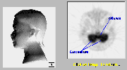 Click on image above to view full-size image.This section, from a more superior aspect of the cervical region reveals the metabolically active cerebellum, part of the central nervous system. The hypermetabolism in the vicinity of the brainstem is due to the presence of a high-grade glioma. Normally, the brainstem and spinal cord are only slightly more active than the surrounding tissue.