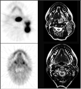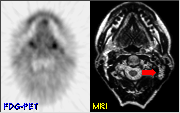 Click on image above to view full-size image.Both surgery and radiotherapy cause edema and loss of tissue planes, making detection of lesions challenging using standard imaging techniques such as CT or MRI. In addition, small lymph nodes may contain metastatic foci. FDG-PET imaging is capable of detecting active tumor foci even in small lymph nodes, and is especially helpful in detecting recurrence following therapy. This is particularly critical in cases of head and neck cancer, where one-third of patients die prematurely due to late diagnosis and inadequate treatment of recurrence.