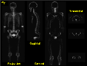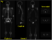 Click on image above to view full-size image.Whole-body image data can be reconstructed and displayed in 2-D projection views, as well as transaxial, coronal and sagittal tomographic views. These images can be displayed individually or in an interactive cine mode, allowing for the analysis of overlying structures.