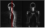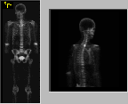 Click on image above to view full-size image.Shown above are 2-D projection images from an 18F- whole-body scan. The image on the left is a shows a normal coronal 18F- projection image. An example of a cinematic image on the right is from a patient with metastatic breast carcinoma. Although less spatially specific, the projection images allow for an overall evaluation of the total-body distribution of 18F- (or FDG) and are thus useful to survey for potential areas of abnormality that later can be fully characterized by tomographic slices. Note that since attenuation correction is typically not applied to the whole-body image data, the reviewer needs to be aware of attenuation artifacts such as the apparent increase in cervical spine activity relative to the thoracic spine due to the patient's arms attenuating the thoracic spine in the lateral projection images.