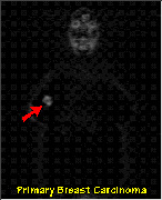 Click on image above to view full-size image.Malignant tissue is characterized by a high rate of glycolysis; hence FDG is rapidly taken up by tumor cells. Large breast carcinoma lesions that are metabolically active have been proven to be visualized easily with conventional transaxial FDG-PET imaging, as shown in the above image (arrow). PET is also capable of detecting anatomically small metastases by virtue of their metabolic differences from surrounding normal tissue.