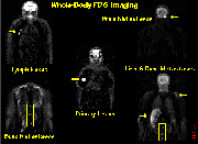 Click on image above to view full-size image.This collage demonstrates how whole-body FDG imaging is useful for the detection of primary breast carcinoma as well as occult lymph node or systemic metastases. In addition, PET may permit physicians to follow the response of adjuvant chemotherapy, adjusting doses and drugs to achieve maximal response.