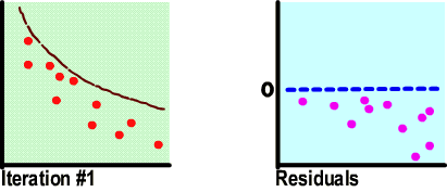 Here is our first iteration.  The residuals, or differences between the data and the predicted values of the regression curve are large- as can be expected in a first attempt.  Many of the residual values are dramatically less than 0, the value they should approach.