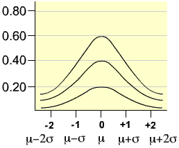The first Illustration shows a few normal curves with equal means, but unequal standard deviations. The tall and skinny graph has a lesser S value than the others, and a greater frequency of values closer to the Mean.