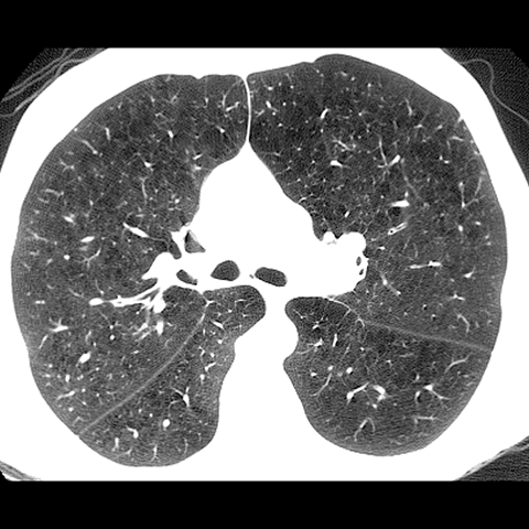 A 62 year-old male presents with chronic shortness of breath (Axial HRCT). [5 of 6]