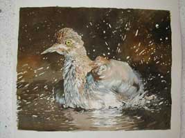 I tend to paint birds that have patterned plumage, preferring birds of prey, like the Martial eagle and usually doing something, like bathing or preening. |