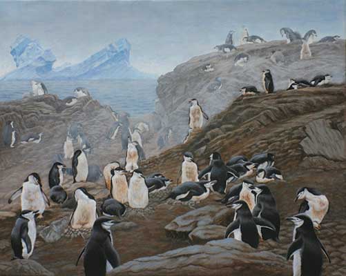 The artist notes: "The Chinstrap Penguin is the second most abundant Antartic/subAntartic penguin. It is concentrated in vast colonies on the Antarctic Peninsula and southern islands. Its diet consists primarily of krill (Euphasia superba), but also includes some crustaceans and fish foraged along the pack ice. For their nesting site, the pair prefer a lofty area that will be the first to become snow free, giving the maximum time to rear the chicks. The female lays two eggs in a nest of small pebbles gathered together. Unlike other penguin species that produce two young at a time, Chinstrap parents treat both chicks equally, rather than favoring the stronger one. This painting illustrates the preferred terrain for nesting, how the nests are constructed with eggs inside, and the close proximity of the pairs.”