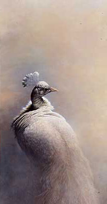 The artist noted: "One early morning I surprised a young white peacock who seemed astonished by my watching him. Birds with white feathers have always fascinated me. Here, I have tried to capture the fluidity of the plumage."