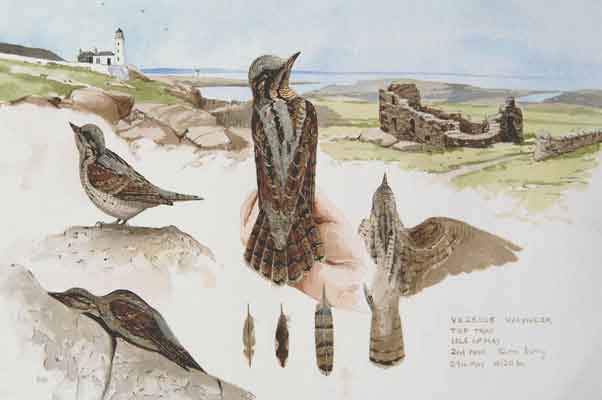 The artist notes: "This set of studies depicts a migrating Wryneck captured and banded at a bird research observatory on the east coast of Scotland. It shows the detailed plumage criteria used to identify the age of the bird, and the cryptic coloration of the feathers. It also portrays several unusual evolutionary aspects of the bird’s behaviour including the camouflaged “freeze” pose where the bird crouches on an exposed tree-stump and appears to be part of a branch. When captured, the bird twists it’s head bizarrely from side to side and hisses with its neck extended in a very snake-like way that appears to be an adaptation to deter potential predators."