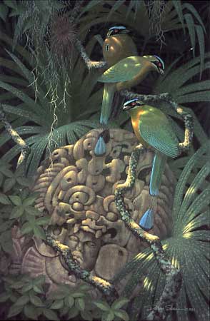 The visually arresting, sun-dappled Blue-crowned Motmots seem well-settled on their ropy perch but look ready to depart, if necessary. The off-kilter ruin offsets the vibrant, tentativeness of the birds, and compells us to look for clues about the failure of the culture that produced it.