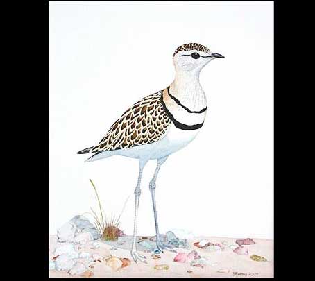 The artist notes: "Coursers are elegant Charadriiforms, and I'd love to paint every one of them. The Double-banded is the first African courser I encountered when in Namibia in 2003."